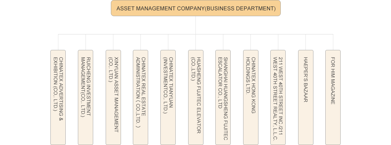The Asset Management Company (Business Department) is mainly responsible for the unified marketization and specialized operation of the non-principal business-related assets of Chinatex Corporation, and for accomplishing mixed-ownership reform by introduction of strategic investors, attraction of shareholding by business elites and other institutional reforms, in a bid to enhance corporate vitality, increase investment returns, improve the ability of state-owned assets to preserve and increase value, and provide more funds and resources for development of the principal business. The scope of business of the company includes advertising and exhibition, magazine publishing, investment in securities and funds, management of non-principal business-related assets (real estate and equity), clearing and disposal of non-performing assets, production and operation of Fujitec elevators and escalators company, property management of Chinatex Mansion and Langfang Chinatex Complex, etc.
