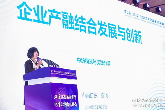 11月22日,第二届(2020)中国大宗商品金融服务创新峰会在杭州成功举办,本次会议主题为“构建衍生品市场新格局,打造‘双循环’发展新引擎”,来自政府、实体企业、金融机构等400余位嘉宾参会。中国纺织党委书记、总经理袁飞出席会议并发表题为《企业产融结合发展与创新》的主题演讲。