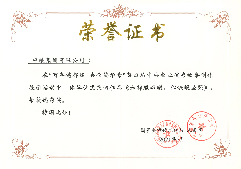 7月,由国资委宣传局、人民网联合主办的“百年铸辉煌 央企谱华章”第四届中央企业优秀故事创作展示活动获奖名单正式公布,中国纺织创作的《如棉般温暖,似铁般坚强》荣获优秀奖。